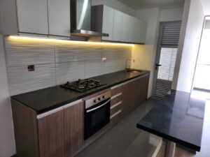 🍳 Cocina cerrada equipada con muebles altos, bajos, tablero de cuarzo, cocina encimera y luces led