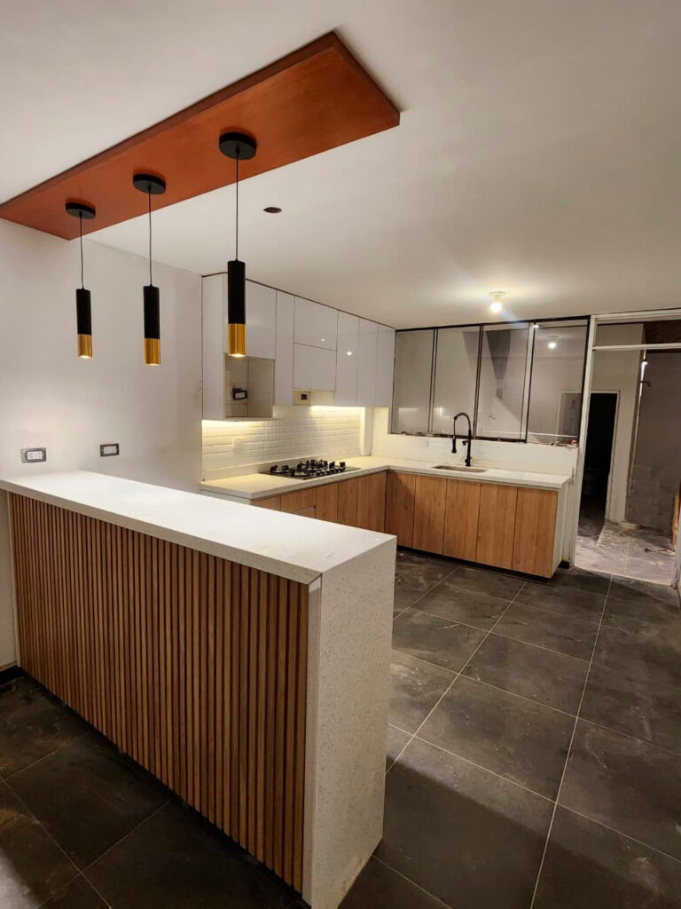 🍳 Cocina cerrada equipada con muebles altos, bajos, tablero de cuarzo, cocina encimera y luces led, barra